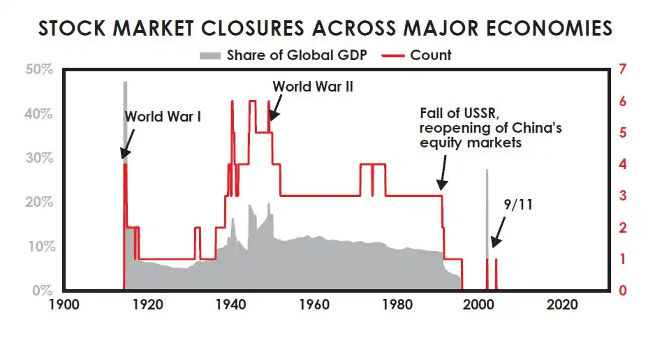 下一张图显示了主要国家股票市场关闭的比例随时间的变化。战时股市关闭很常见,共产主义国家当然也在超过一代人的时间里关闭了股票市场。