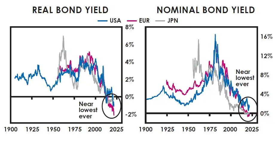 撰写本文时,储备货币主权债券的实际收益率接近有史以来最低,名义债券收益率约为 0%,也接近有史以来最低。正如所示,现金的实际收益率更低,尽管还没有 1930-45 年和 1915-20 年大量印钞时期那么负。名义现金收益率也接近有史以来最低。
