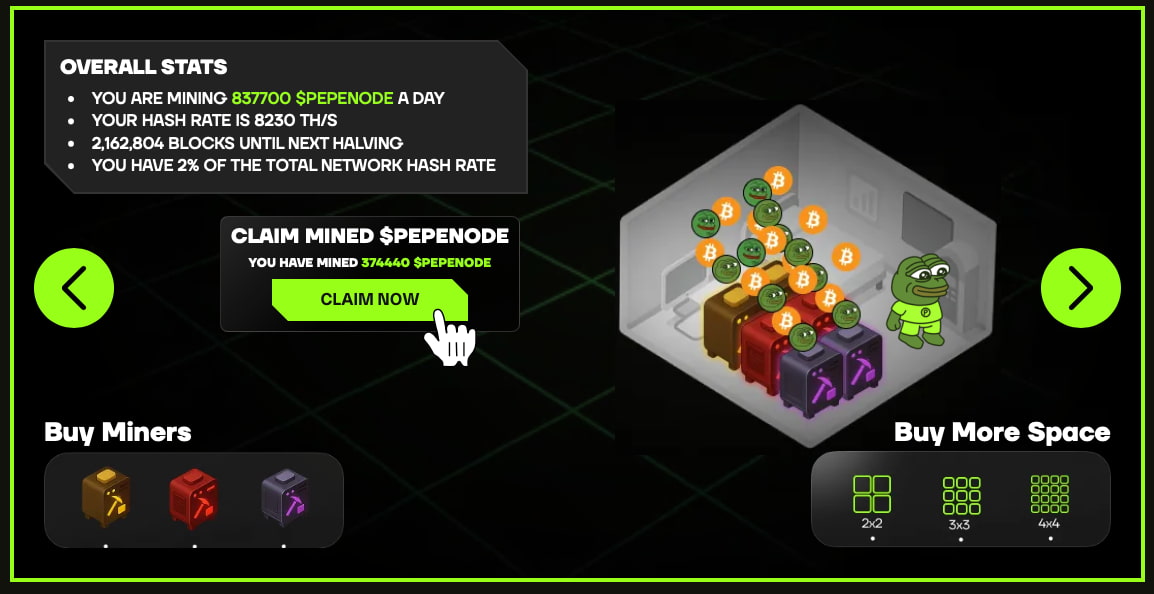 玩家确实可通过设置赚取PEPENODE,但该代币不仅是奖励。其作用更深层——在游戏中花费越多PEPENODE微调优化矿机,解锁更高层级收益的机会越大,包括Pepe(PEPE)和Fartcoin(FARTCOIN)等主流meme币奖励。