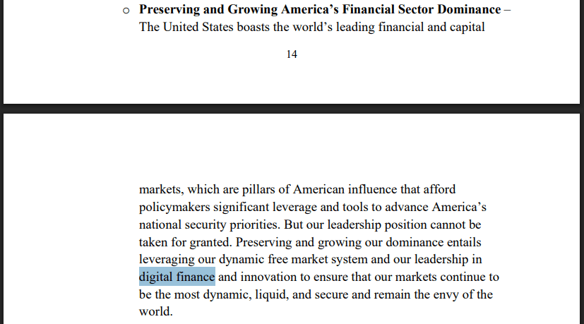 文件中某处提到,特朗普旨在通过利用美国"在数字金融与创新领域的领导地位"来维持和扩大"美国金融部门的主导地位",以保障市场流动性和稳定性——部分观察者认为这可能暗指加密货币。