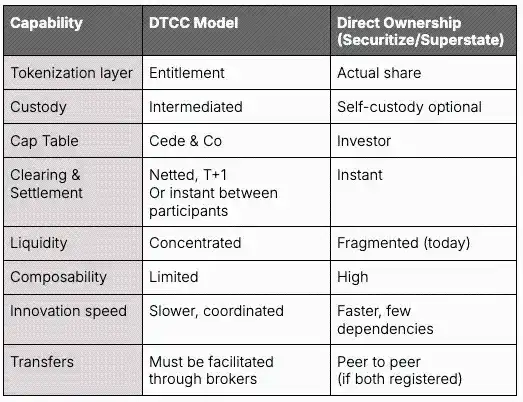 这两种模式之间存在关键差异。DTCC 模型与现有体系的兼容性与可扩展性要强得多;而直接所有权模型则为自我托管等创新打开了更大的空间。