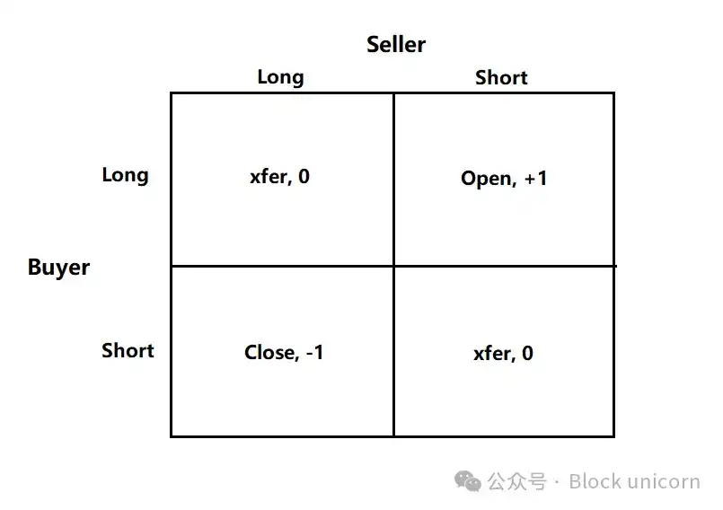 每笔交易都有买方和卖方。当合约的买方和卖方均为多头或均为空头时,交易所仅将合约的所有权从一方转移给另一方。此转移不会创建或销毁任何合约。当买方做多而卖方做空时,必须创建新合约,买方承担多头头寸,卖方承担空头头寸,未平仓合约量增加 1 份。另一方面,如果卖方做多而买方做空,交易所可以直接解除买方和卖方的合约,并删除新释放的合约,未平仓合约量减少 1 份。