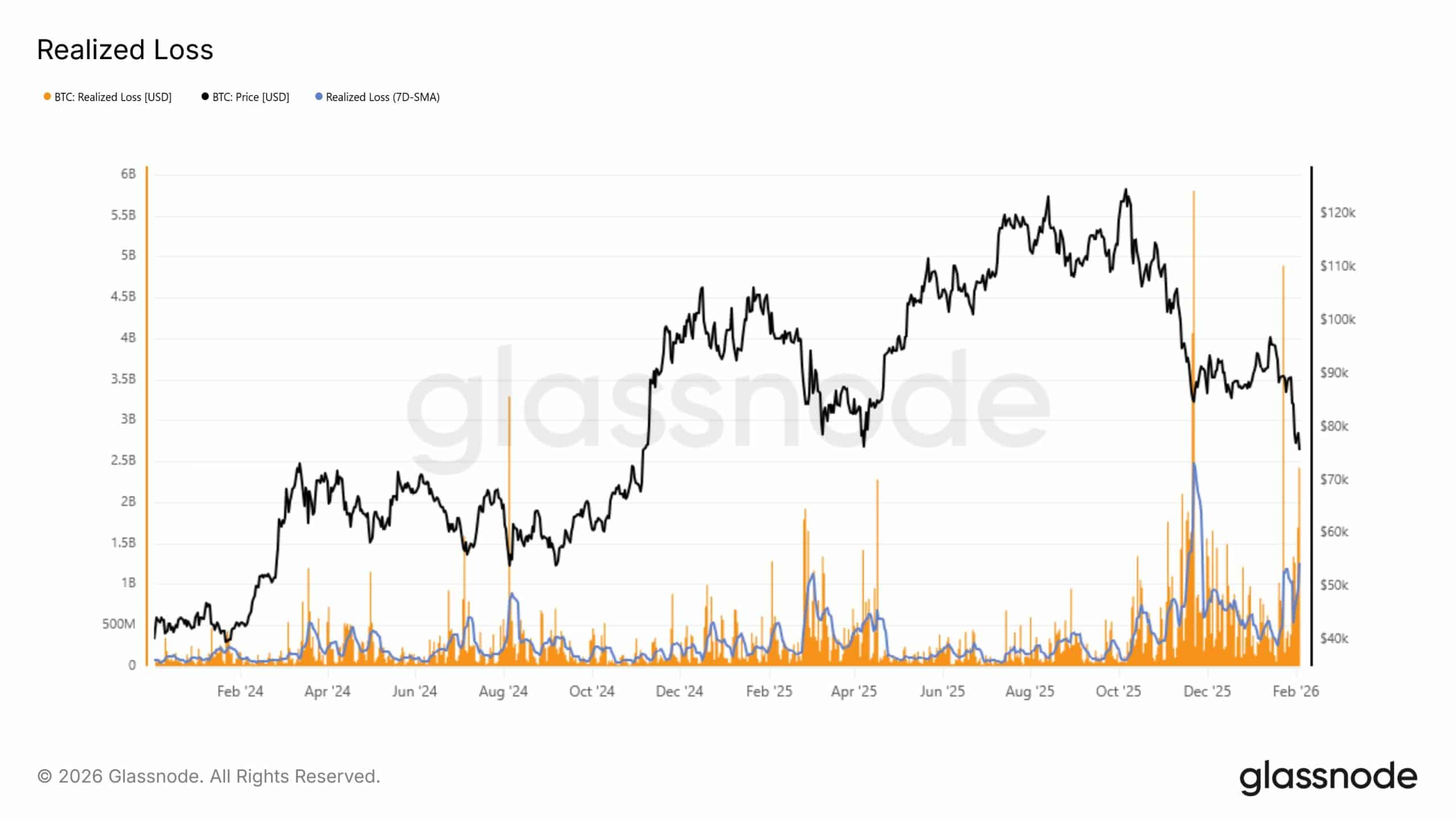 峰值已实现亏损现已接近前周期极端水平,单日数值超50亿美元,堪比2022年末的投降程度。