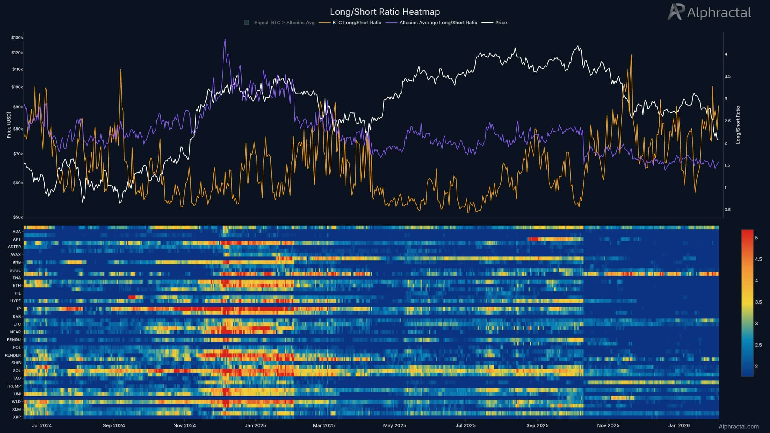 比特币多头需求仍占主导,比率常超2.5-3.0,而山寨币平均值维持在1.5-2.0区间。