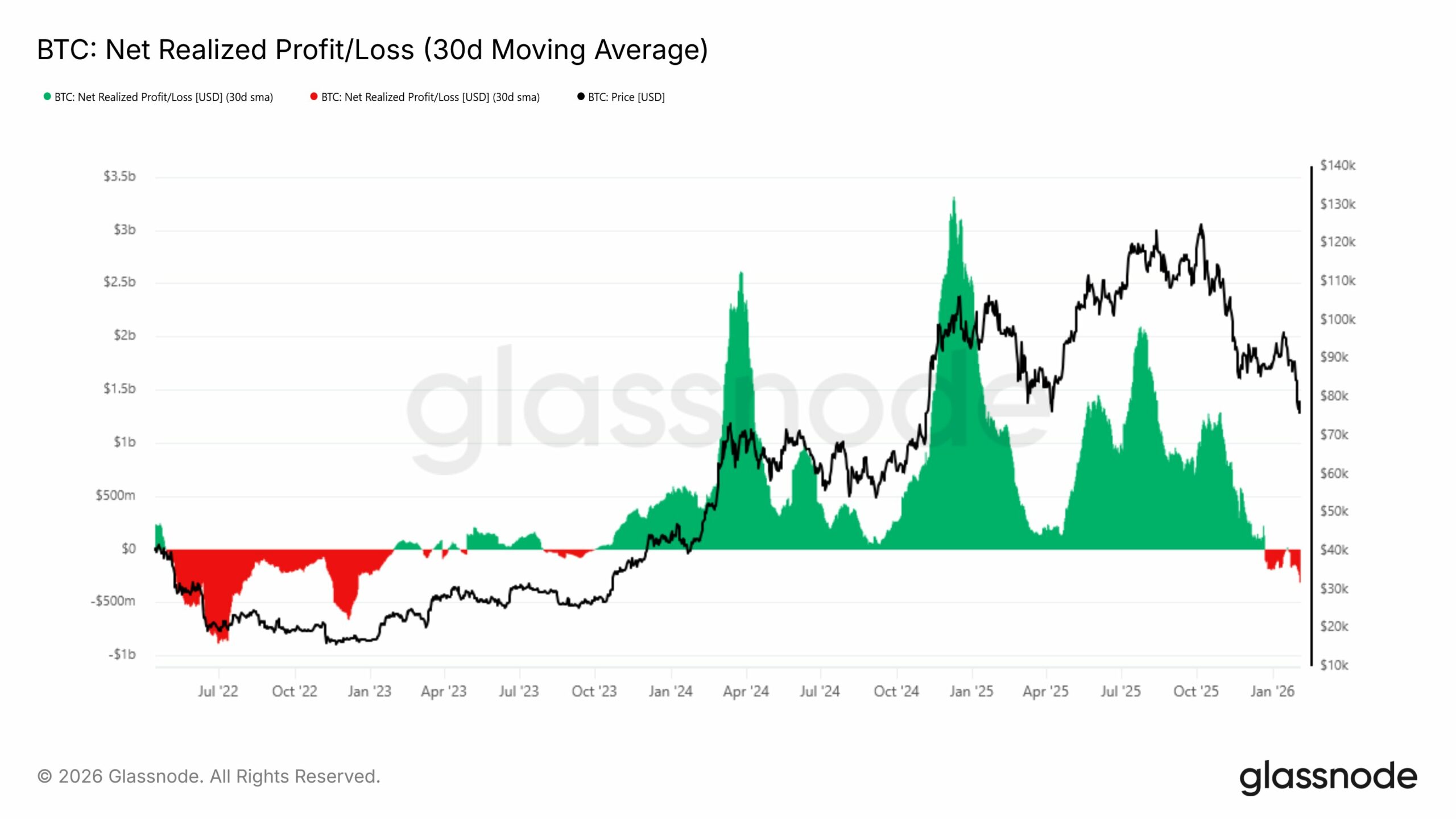 随着分布阶段已实现亏损扩大,盈利能力持续重置,强化了持续的卖方压力。