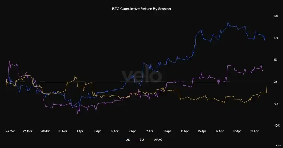 然而,单靠这一点还不足以完全解释盘面走势。截至 4 月 19 日的一周内,Strategy 高达 25.4 亿美元的买入量超过了 ETF 的净流入量。这印证了一个更合理的解读:不是“ETF 缺席了”,而是 ETF 和 Strategy 都在买,且 Strategy 的买盘规模足够庞大,已成为市场上最重要的边际买盘之一,这也完全吻合交易时段的图表走势。既然几乎所有的收益都落在美国交易时段,而且美国最大的买家之一砸下了 25.4 亿美元,那么 Strategy 对 BTC 价格的绝对影响力是不言而喻的。