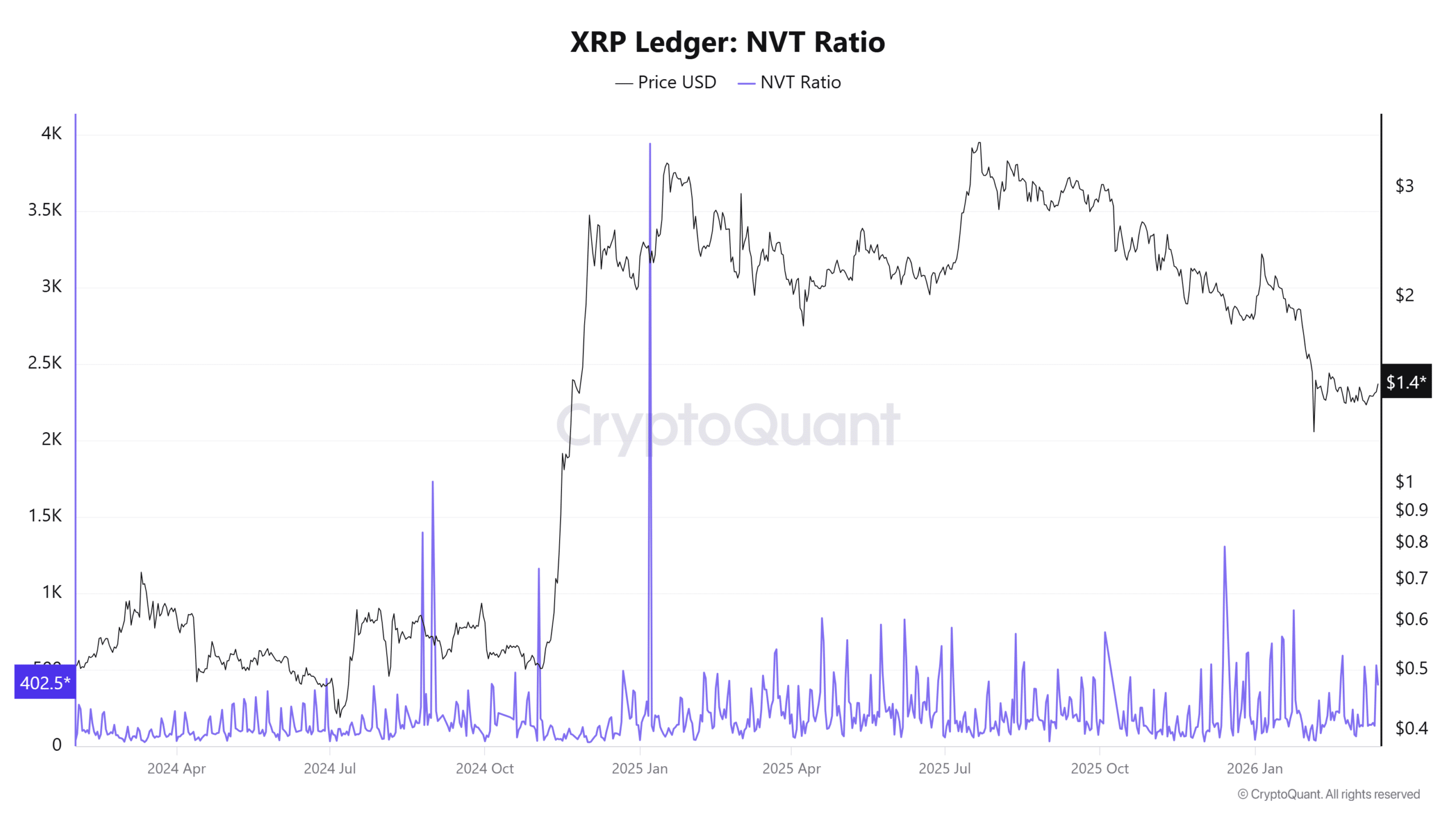 该指标在发稿时位于402.52附近,在过去24小时内下降了23.95%。如此降幅表明,相对于其市场估值,XRP账本上的交易活动有所增加。