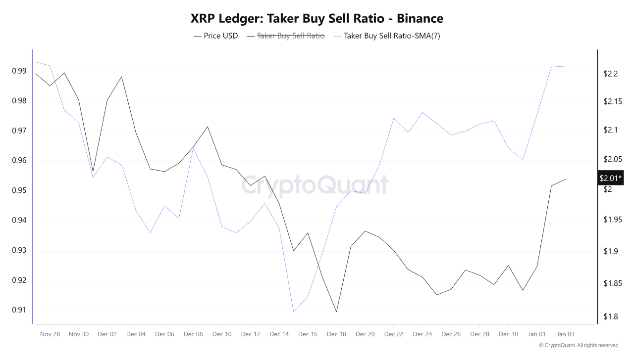 虽然仅凭价格走势不足以确认趋势反转,但链上和衍生品数据表明短期动态发生了显著变化。CryptoOnchain分享的见解解释说,币安数据显示XRP的吃单买入/卖出比率显著改善,其7日移动平均线升至0.991,这是自11月下旬以来的最高读数。该指标追踪激进买家和卖家之间的平衡,为了解谁愿意跨越价差并主导市场方向提供了洞察。