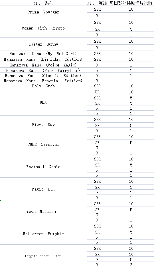 持有Prime Voyager,Women With Crypto,Hanazawa Kana ,Easter Bunny ,Holy Crab,Ula,Pizza Day ,CUBE Carnival ,Football Genie ,Magic ETH ,Moon Mission, Halloween Pumpkie, CryptoSoccer Star 以上十三种系列NFT中任一 一种都可获取额外权益。佩戴NFT头像即可每日获得卡片,根据佩戴的头像等级决定送卡数量, CryptoSoccer Star 获得的卡片数量是Prime Voyager,Women With Crypto,Hanazawa Kana ,Easter Bunny,Holy Crab, Ula NFT, Pizza Day ,CUBE Carnival NFT,Football Genie,Magic ETH ,Moon Mission, Halloween Pumpkie 获得卡片的两倍。拥有稀有款NFT获得的卡片数量是普通款NFT获得卡片数量的两倍。