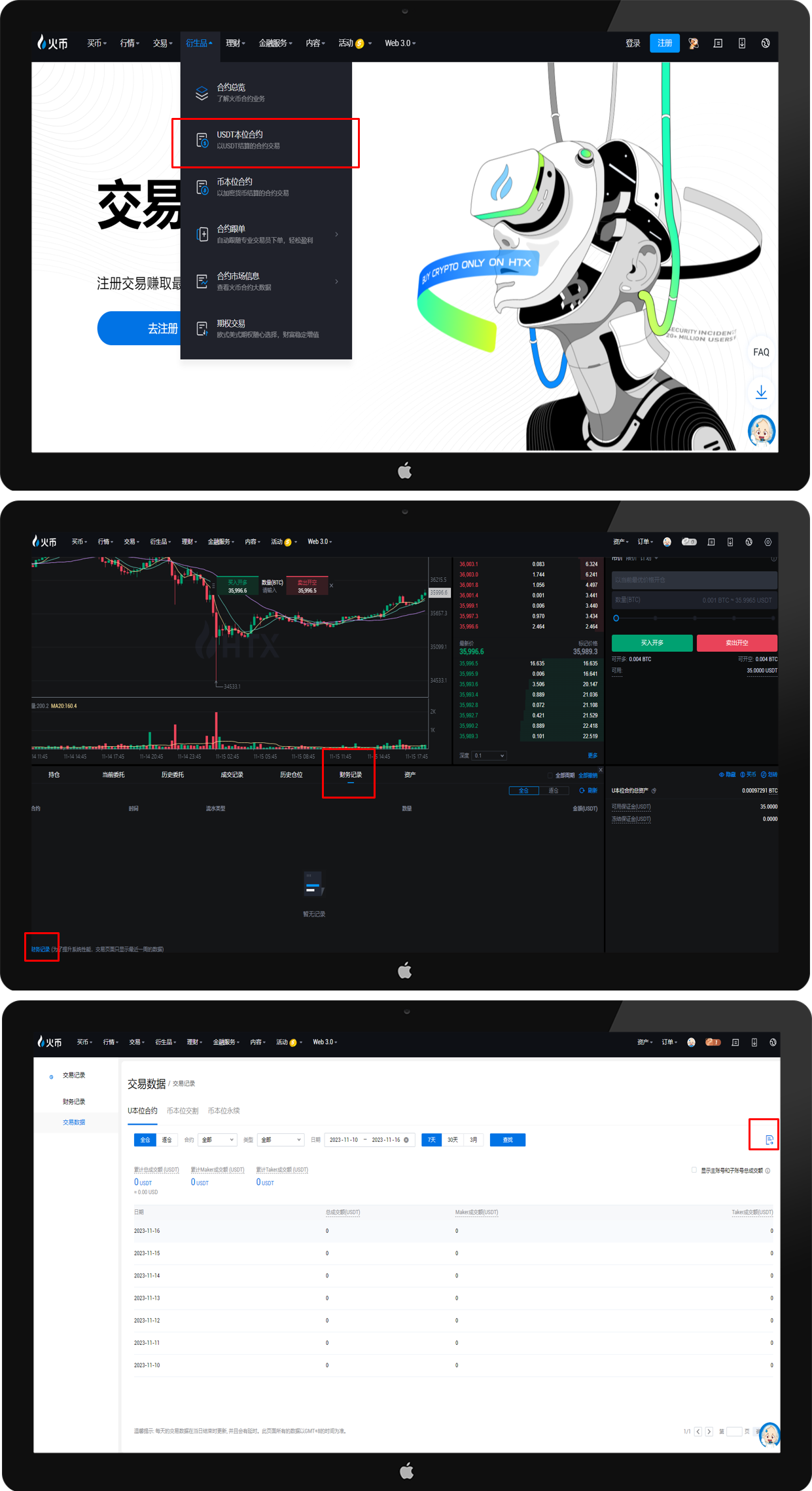 登陆官网,登录官网后,顶部导航栏选择【衍生品】,下图图以U本位合约为例,点击【USDT本位合约】,进入合约交易页面,点击【财务记录】,左下角点击【财务记录】即可进入交易详情界面,可根据您的需求进行点选您要查询和下载的交易记录。