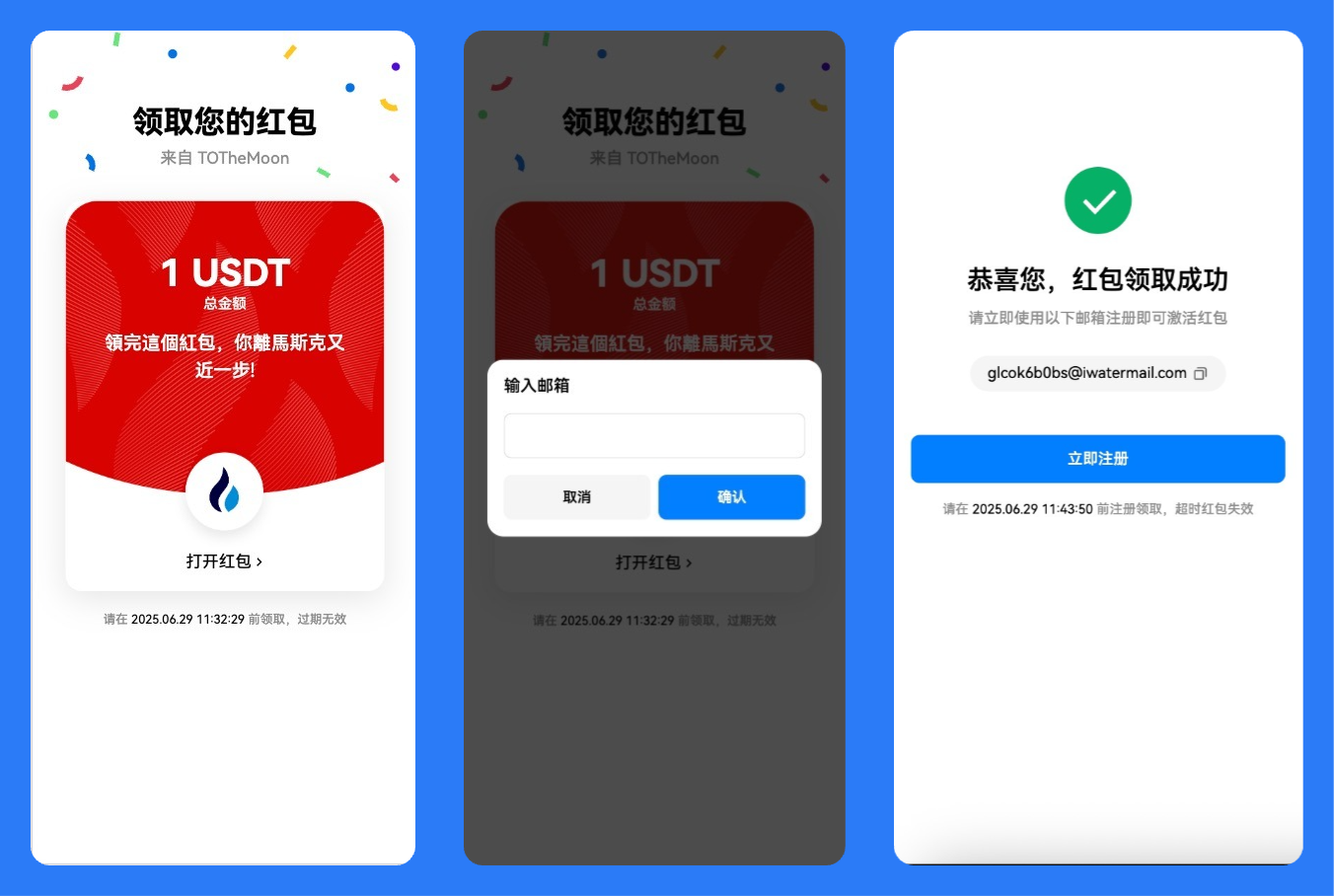 点击他人向您发送的【红包链接】- 输入邮箱地址,确认邮箱地址无误后即可成功领取红包。
