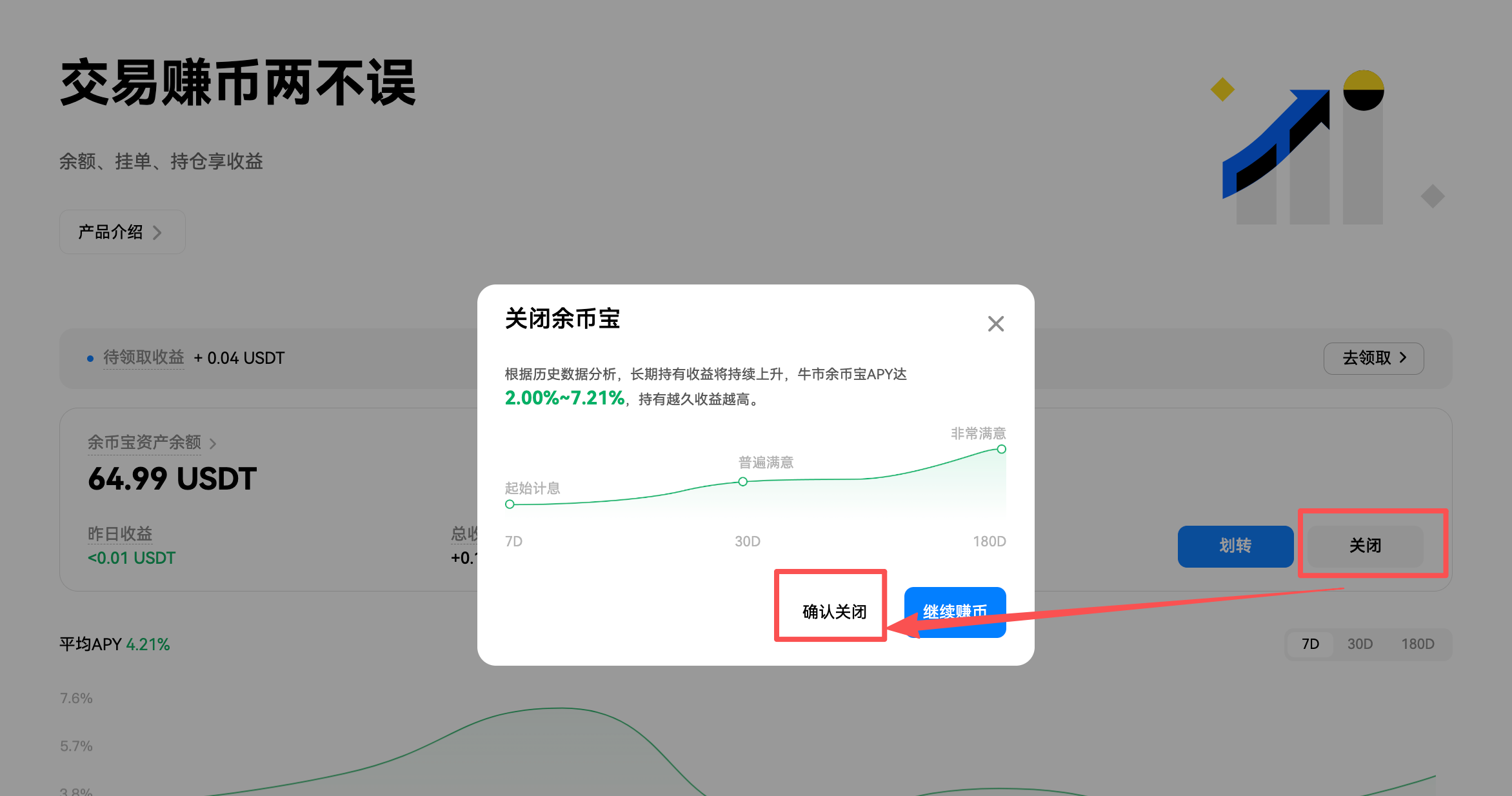 【方法一】进入余币宝产品主页,点击主页上的”关闭”按钮,即可关闭余币宝功能