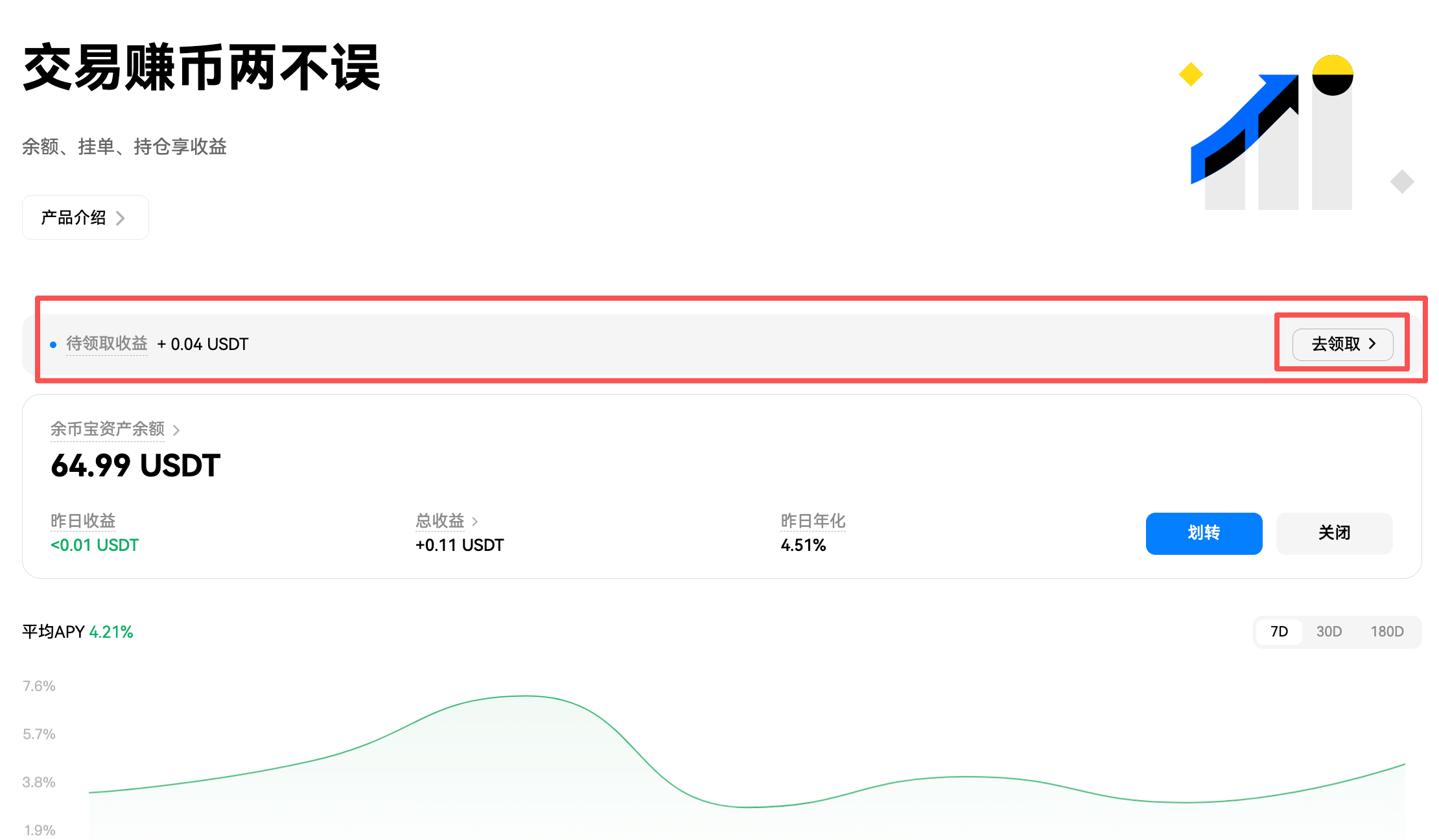 如果不小心点击了弹框内的放弃按钮,在余币宝主页可见”待领取收益”字段,点击右侧的领取按钮一样可以完成历史积分兑换流程。