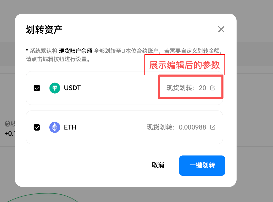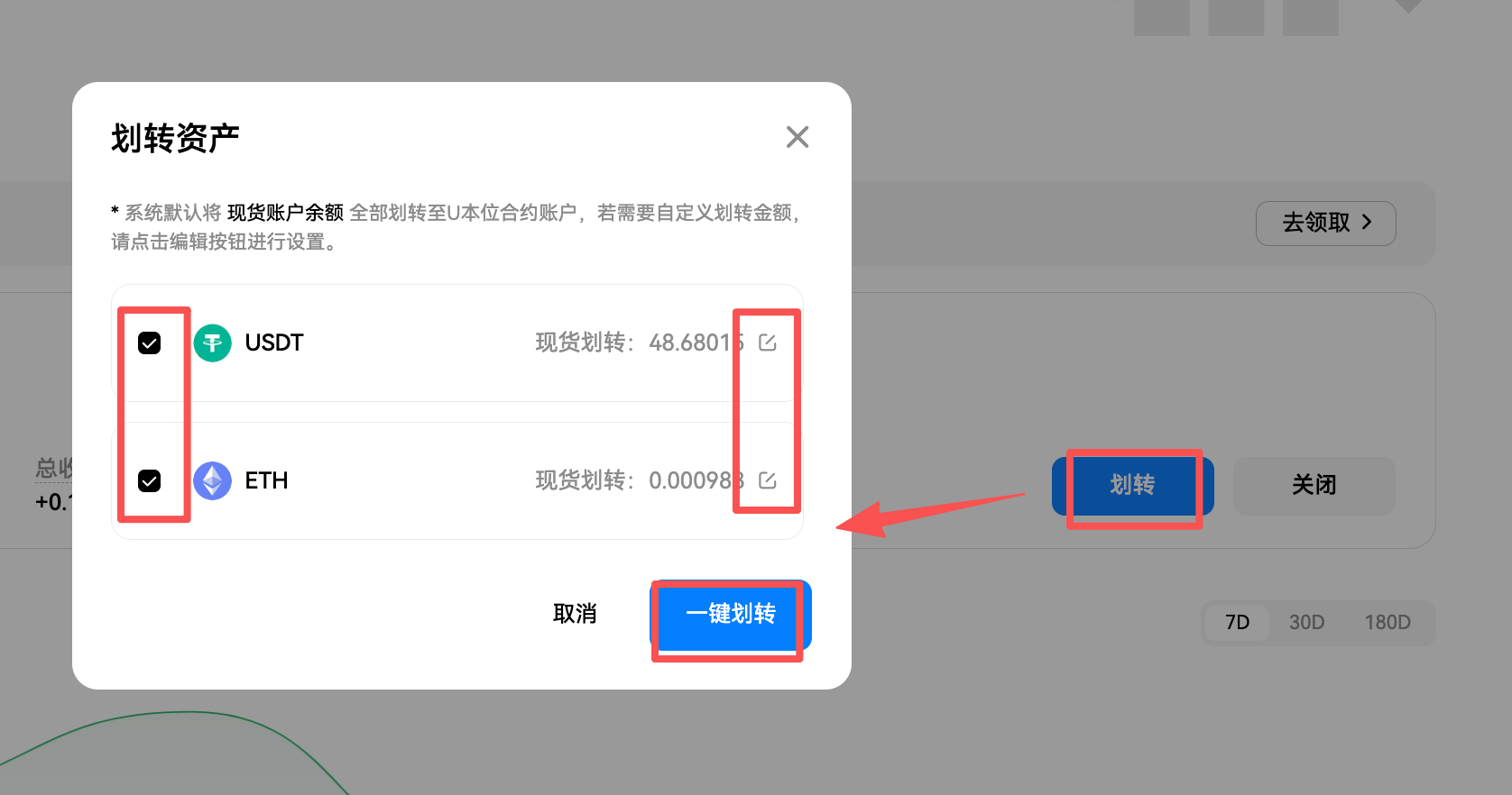 当余币宝支持的币种在现货账户内有余额时,余币宝产品主页会展示”划转”按钮。点击划转后进入浮窗,系统默认勾选全部可转币对,划转数量默认为现货账户最大可转出金额。您可选择需要转入的币种,也可以点击币种旁边的编辑按钮去独立配置每个币种转入的金额。设置完成后点击”一键划转”即可。
