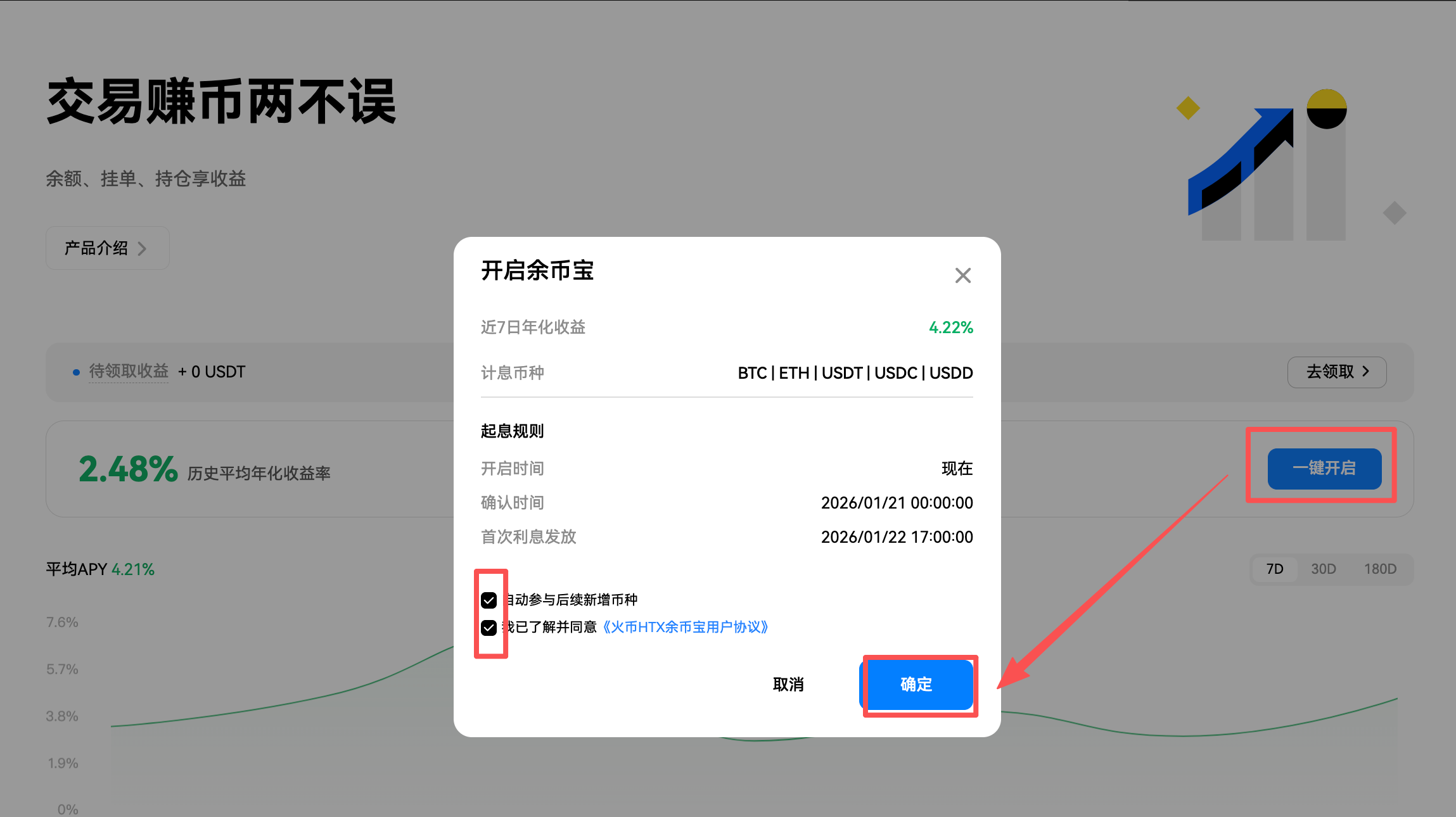 【方法一】进入余币宝产品主页后,点击”一键开启”按钮。阅读协议后勾选同意,并且勾选”自动参与后续新增币种”,最后点击”确定”即可