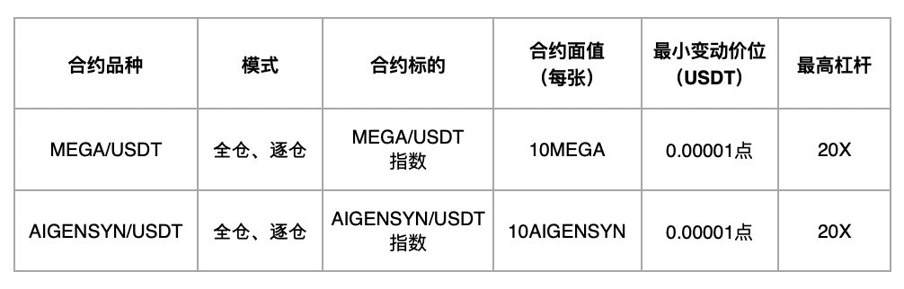 火币HTX已上线MEGA和AIGENSYN品种USDT本位永续合约