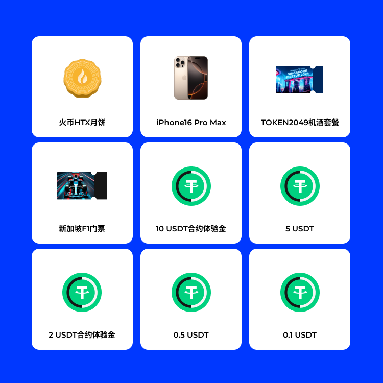 - iPhone16、火币HTX月饼、TOKEN2049机酒套餐、新加坡F1门票,将折合为等值的USDT形式,发放到用户的【我的福利】中。