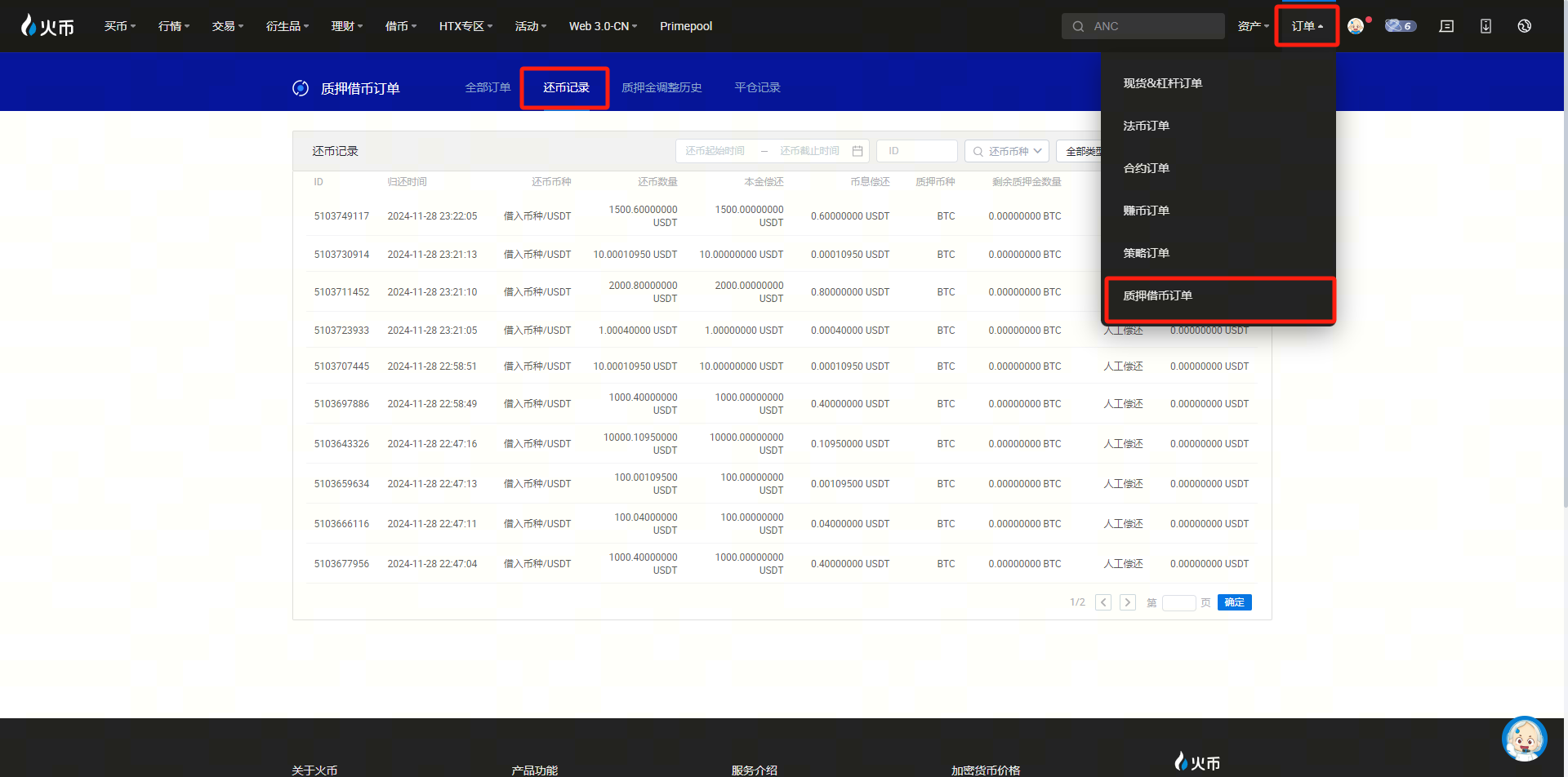 登录系统后,下滑进入【在借订单】页面或点击页面右上角【订单】-【保证金换币订单】-【全部订单】。