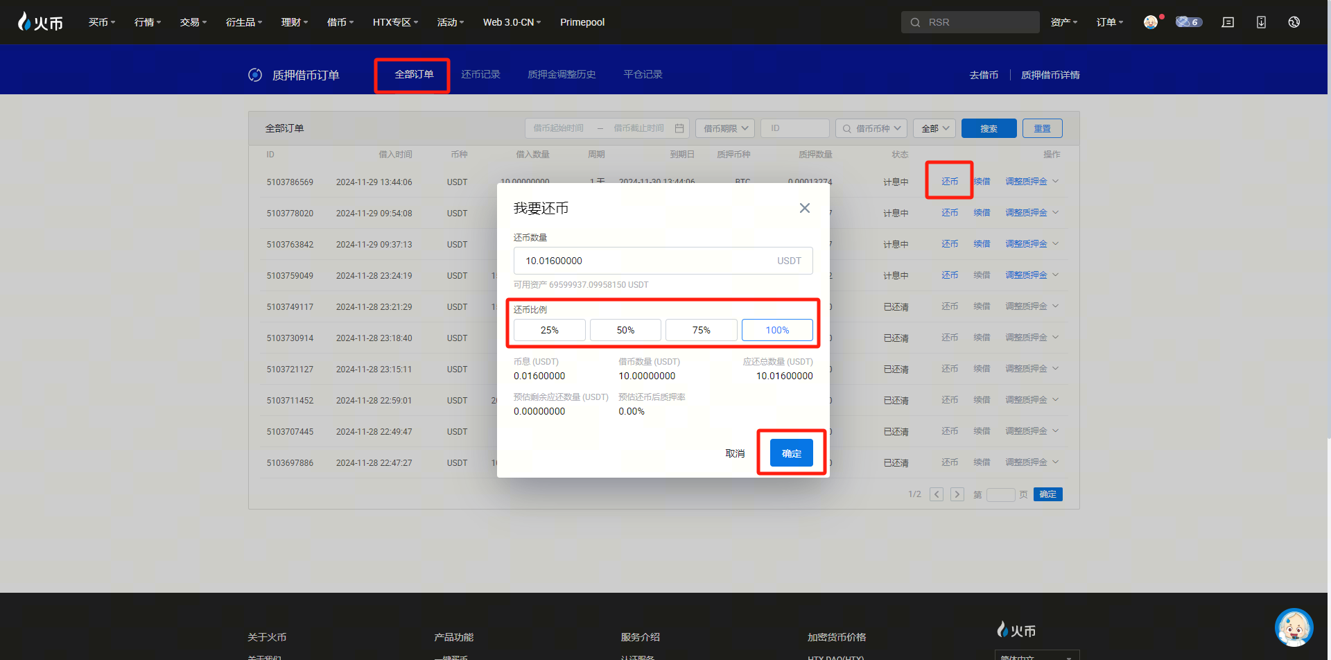 注意:请确保您的现货账户中有足够的币种用于归还所产生的币息与本金。全额还币后,所有质押币将会归还至您的现货账户。