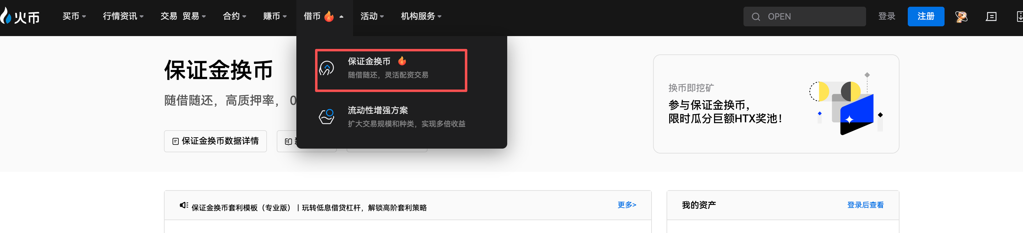 登录火币站账户,在顶部导航栏点击【借币】,进入【保证金换币】界面。
