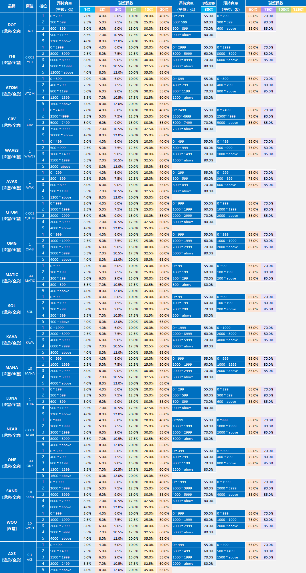3.對以下USDT本位永續合約品種的階梯調整係數進行調整,此次調整僅對原先每檔的淨持倉進行調整,每檔調整係數保持不變。
