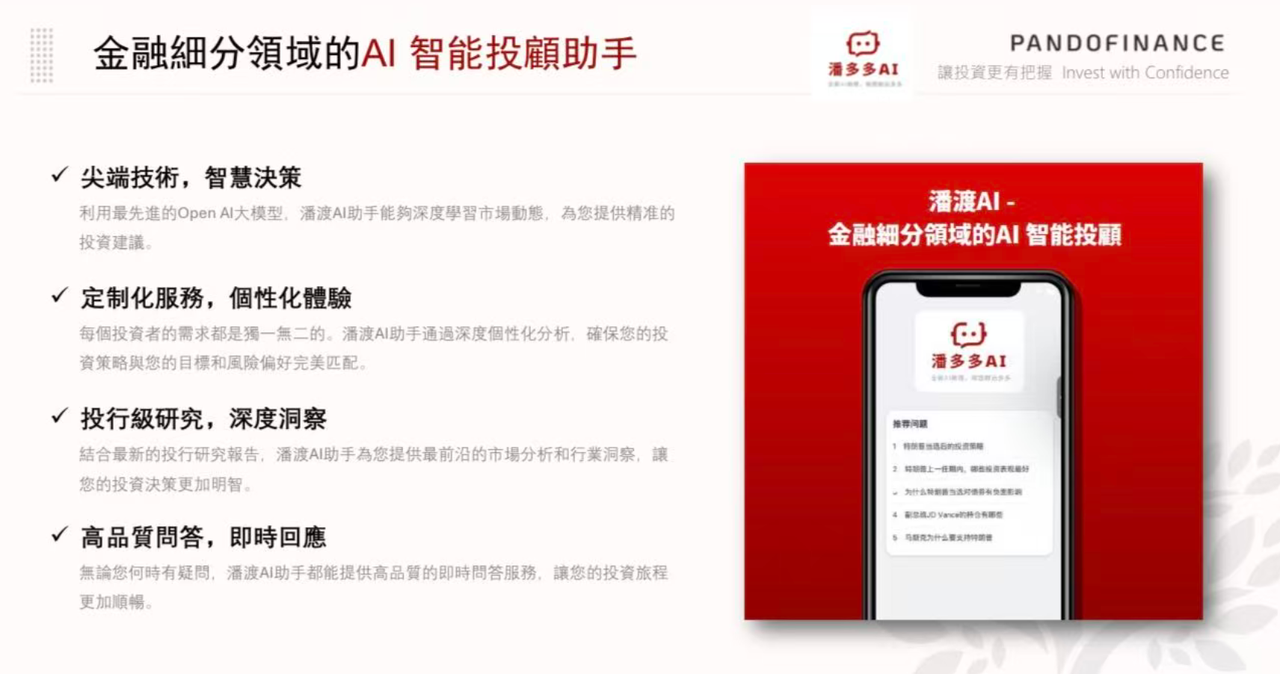 在技术强大的同时,潘渡注重投资体验的亲民化。AI 助手扮演 24 小时私人投顾角色,支持个性化风险评估、即时高品质问答与动态仓位建议。系统根据用户风险偏好匹配策略,保守型客户获得低波动套利方案,激进型客户捕捉高 Alpha 机会。市场剧烈波动时,AI 提供数据支撑的危机预警与理性分析,帮助投资者维持冷静,避免情绪化决策。这种设计不仅降低了专业门槛,还让高净值客户在繁忙的商业生活中也能轻松把控资产动态,真正实现「让投资更简单、更可靠」的目标。潘渡 AI 还支持多语言交互与定制化报告生成,无论用户身处香港、新加坡还是欧美,都能获得一致的高品质服务体验。