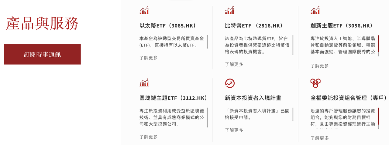 此外,潘渡积极布局虚拟资产现货 ETF,如比特币 ETF(2818.HK),紧密追踪比特币价格,提供合规、低成本的加密敞口。