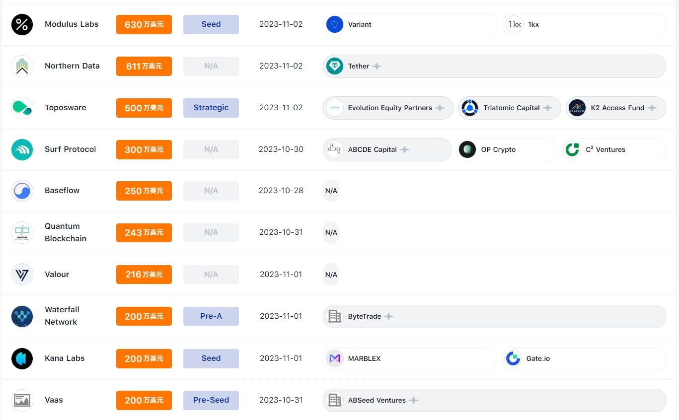 据 Foresight News 统计,10 月 28 日至 11 月 23 日期间,加密市场共发生 16 笔投融资事件,其中工具和基础设施 8 笔、 DeFi 领域 1 笔、资管领域 3 笔、链游和 NFT 领域 0 笔、Web3 领域 4 笔。已披露投融资总金额约 3.86 亿美元。