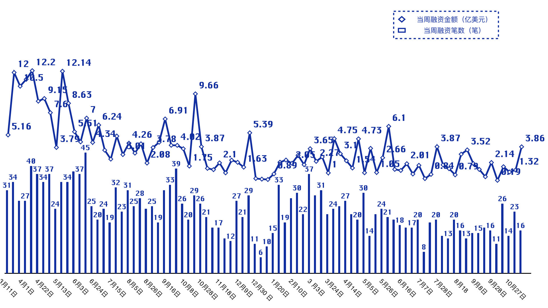 周级别已披露融资总额及融资笔数汇总图: