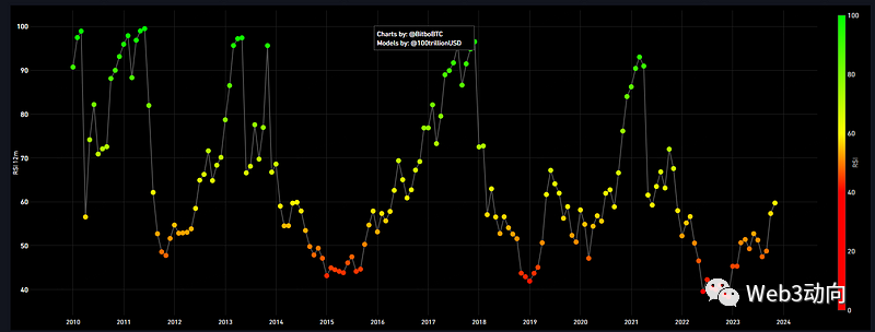 指标介绍:RSI(Relative Strength Index,相对强弱指标)是一种衡量比特币价格变动的速度和幅度的指标,以观察的月份的前 12 个月表现计算出 RSI 分数,用来判断市场走势强弱,正处于超买还是超卖的区间。上涨的力道越强,RSI 就会越接近 100,而高 RSI 也表示价格变动在过去的 12 个月内较为正面;反之下跌的力道越强,RSI 就会越接近 0,低 RSI 值意味著价格变动相对较负面。