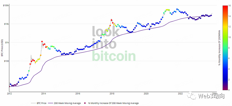 根据 200 周移动平均线的逐月百分比增长,将一种颜色分配给价格图表。
