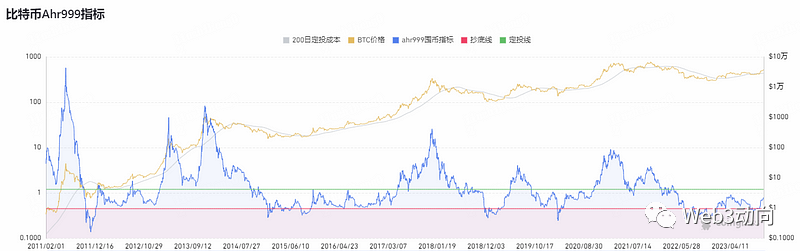 指标介绍:该指标由微博用户 Ahr999 创建,辅助比特币定投用户结合择机策略做出投资决策。该指标隐含了比特币短期定投的收益率及比特币价格与预期估值的偏离度。