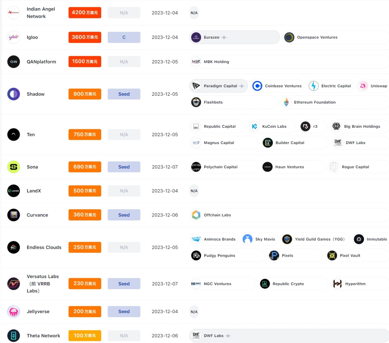 本周过亿美元融资 1 笔,比特币金融服务公司 Swan 完成 1.65 亿美元融资,将推出比特币借贷产品。千万级美元融资共 4 笔,其中包括 Mocaverse 完成 1188 万美元新一轮融资,Foresight Ventures 参投;比特币质押协议 Babylon 完成 1800 万美元融资,Polychain Capital 和 Hack VC 领投;Layer1 区块链 QANplatform 完成 1500 万美元融资,MBK Holding 投资;区块链保险科技公司 Igloo 完成 3600 万美元 C 轮预融资,Eurazeo 领投。