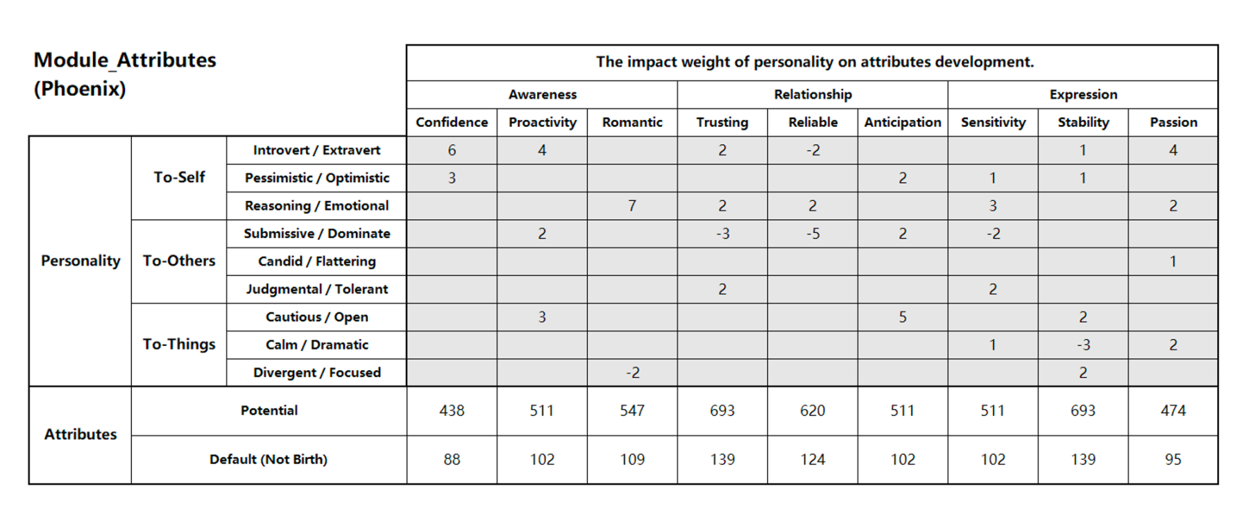HIM 的开发团队也做了一套虚拟人的 AI 训练方法,具体可以参考下面两张数值矩阵: