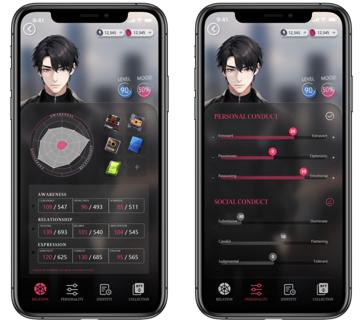 说到数值,第一个想到的就是传统游戏虚拟角色战斗的数值平衡。但是格局再打开一点,HIM 通过数值将一个人完整的描述出来,用多维度的数值去定义一个虚拟人,并且建立了一个健全的数值养成系统。总的来说,HIM 将数值系统应用到了一个更加广义的虚拟人上,从而使游戏交互体验更加真实和饱满。