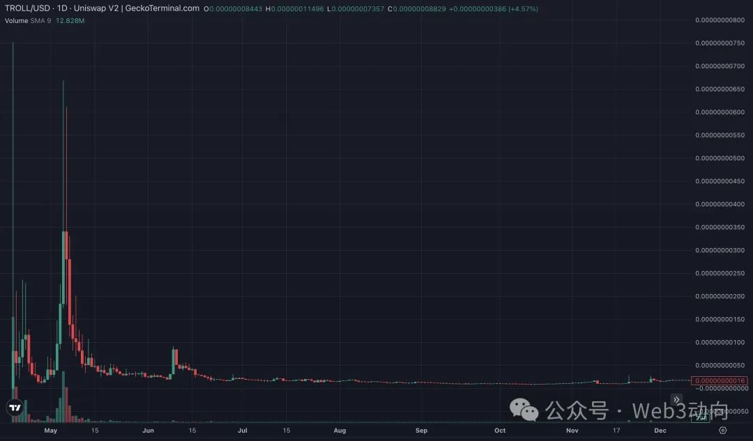 更为有趣的是,TROLL 的上涨是阴差阳错。该代币并非近日才应运而生的马斯克概念 meme 币,而是早在 2023 年 4 月就已部署。在马斯克成为首席巨魔官之前,该代币价格早已从最高点跌去 98% 。这是一款名副其实的“归零币”。
