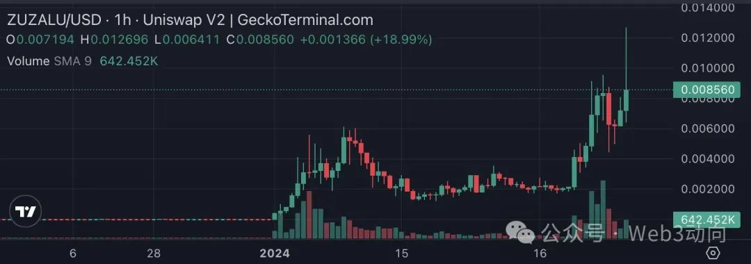 GeckoTerminal 数据显示,在 1 月 14 日之前,其价格仅为 0.000008 美元一枚,而近日最高涨至 0.012 美元,最高涨幅 1500 倍。即使是以现价计算,涨幅仍然超过了 1000 倍。
