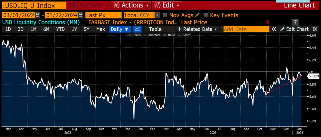 该图表是该指数的子组成部分,是 RRP 和 TGA 余额变化的净值。 自 2023 年 6 月美国政府通过预算以来,已新增近 8000 亿美元的流动性。