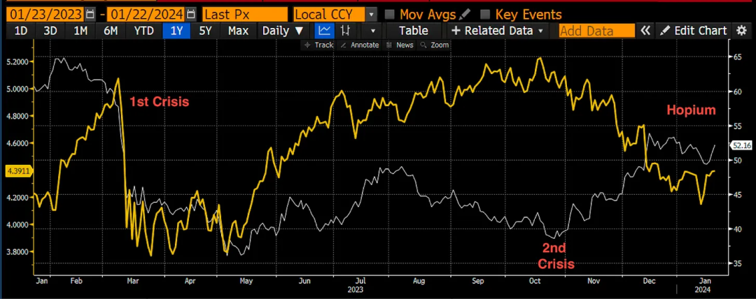 耶伦有机会在即将于 1 月 31 日发布的 QRA 中为市场注入更多活力。 如果她宣布将把 TGA 从 7500 亿美元削减到零,那么我们就知道还有另一个市场没有预料到的流动性来源可以支撑市场。 那么问题就变成了:一旦 BTFP 不续签,是否足以预防任何银行倒闭?
