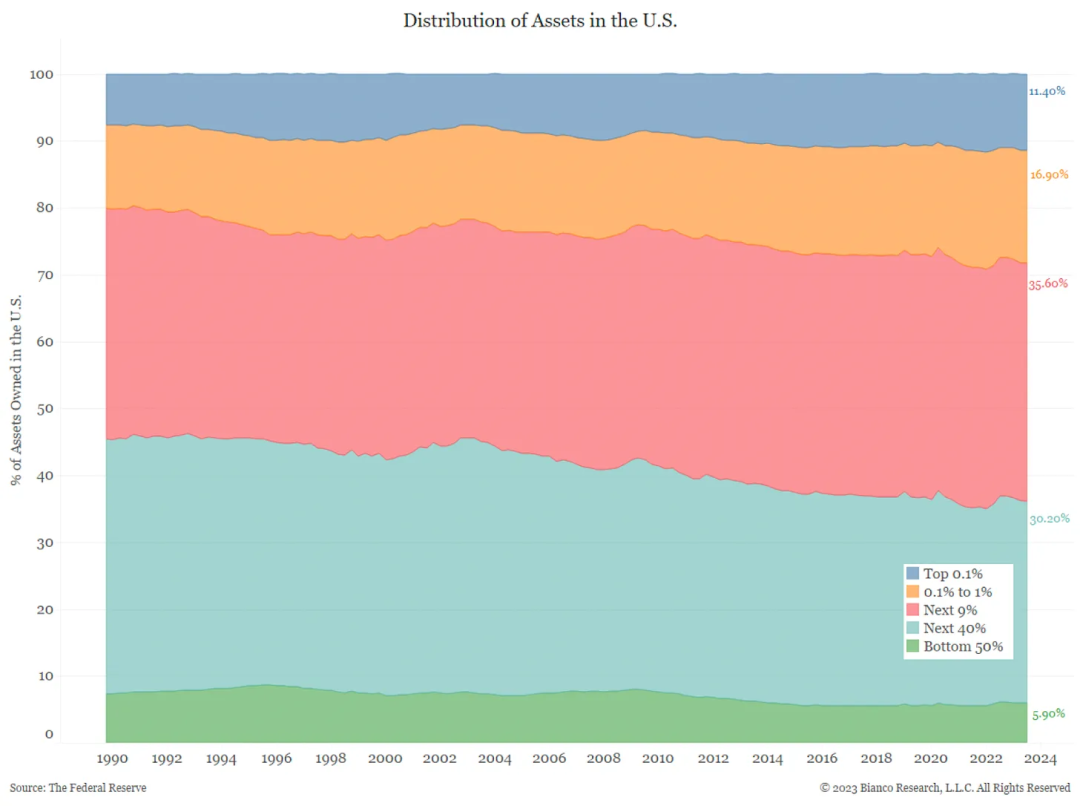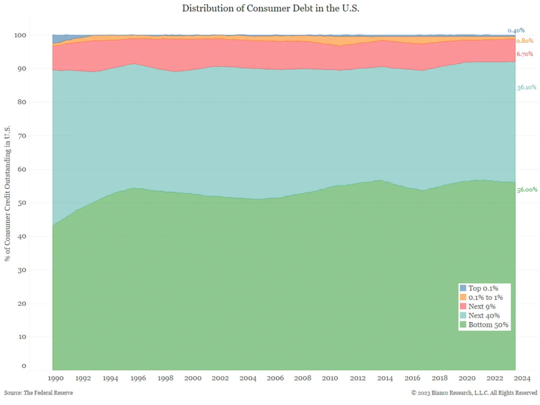前 10% 的人持有约 65% 的金融资产,但只持有约 8% 的债务。 底层 90% 的人持有 92% 的债务,但只持有 35% 的资产。
