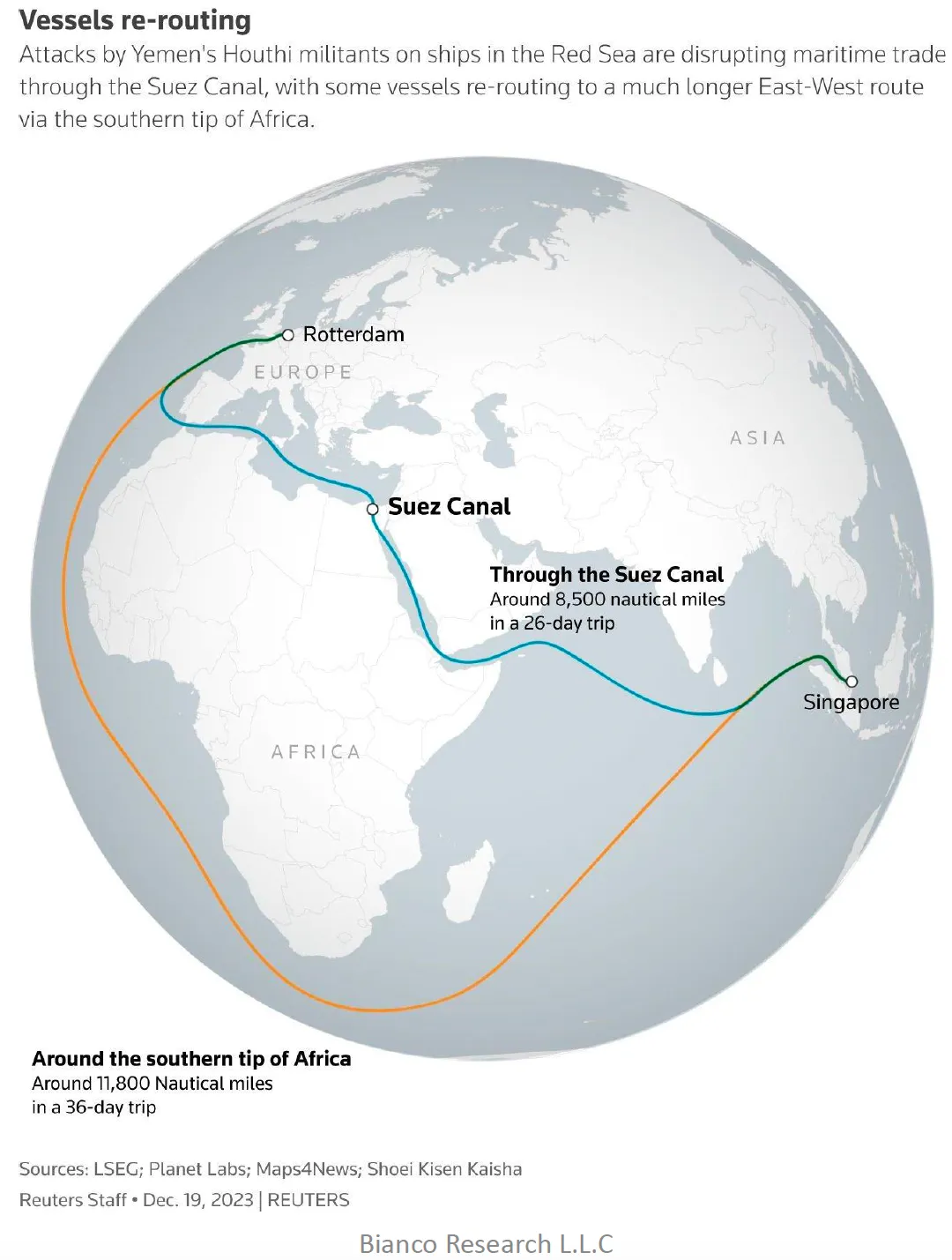 航运是一项古老但重要的业务。 与铁路、公路或航空相比,海运每公里旅行的成本最便宜。 如果没有巴拿马运河或曼德海峡,船只必须绕行合恩角或好望角。 厄尔尼诺天气模式的出现导致巴拿马运河出现干旱,导致运河内水位低于平均水平,这意味着可以通过的船只减少。 也门胡塞武装的非对称无人机战有效地封锁了西方船只的曼德海峡。 他们现在必须绕过好望角航行。