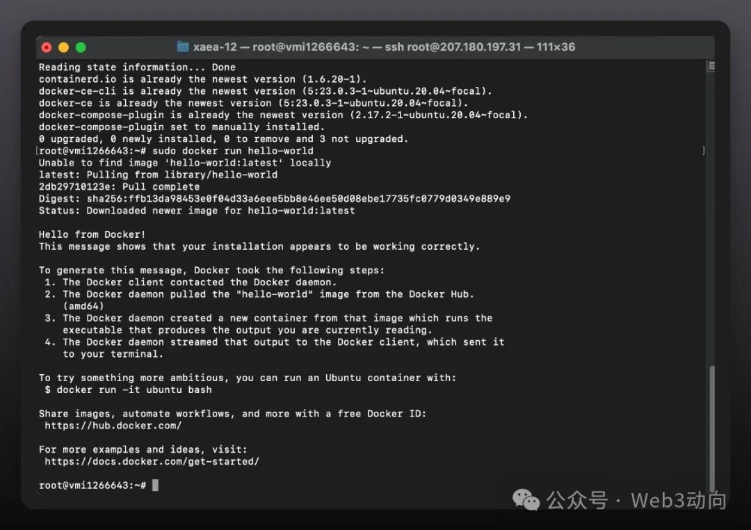要检查一切是否正常,请运行:sudo docker run hello-world