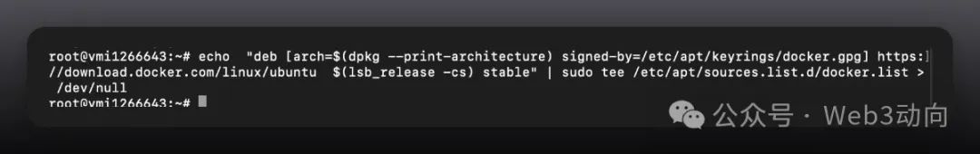 echo "deb [arch=$(dpkg --print-architecture) signed-by=/etc/apt/keyrings/docker.gpg] https://download.docker.com/linux/ubuntu$(lsb_release -cs) stable" | sudo tee /etc/apt/sources.list.d/docker.list > /dev/null