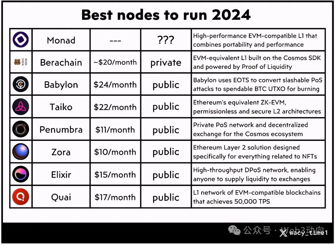 节点运行者正在赚大钱,SOL节点赚取超过 500,000 美元,TIA节点赚取超过 8万美元。加密研究员AlΞxWacy收集了8个“最有钱途”的节点,这些节点确实有机会慷慨地奖励用户,目前关注的人并不多。值得注意的是,维护一个节点的费用每月为10至30美元。这笔钱用于启动VPS服务器。如果您的资源有限,建议选择您最感兴趣的项目。