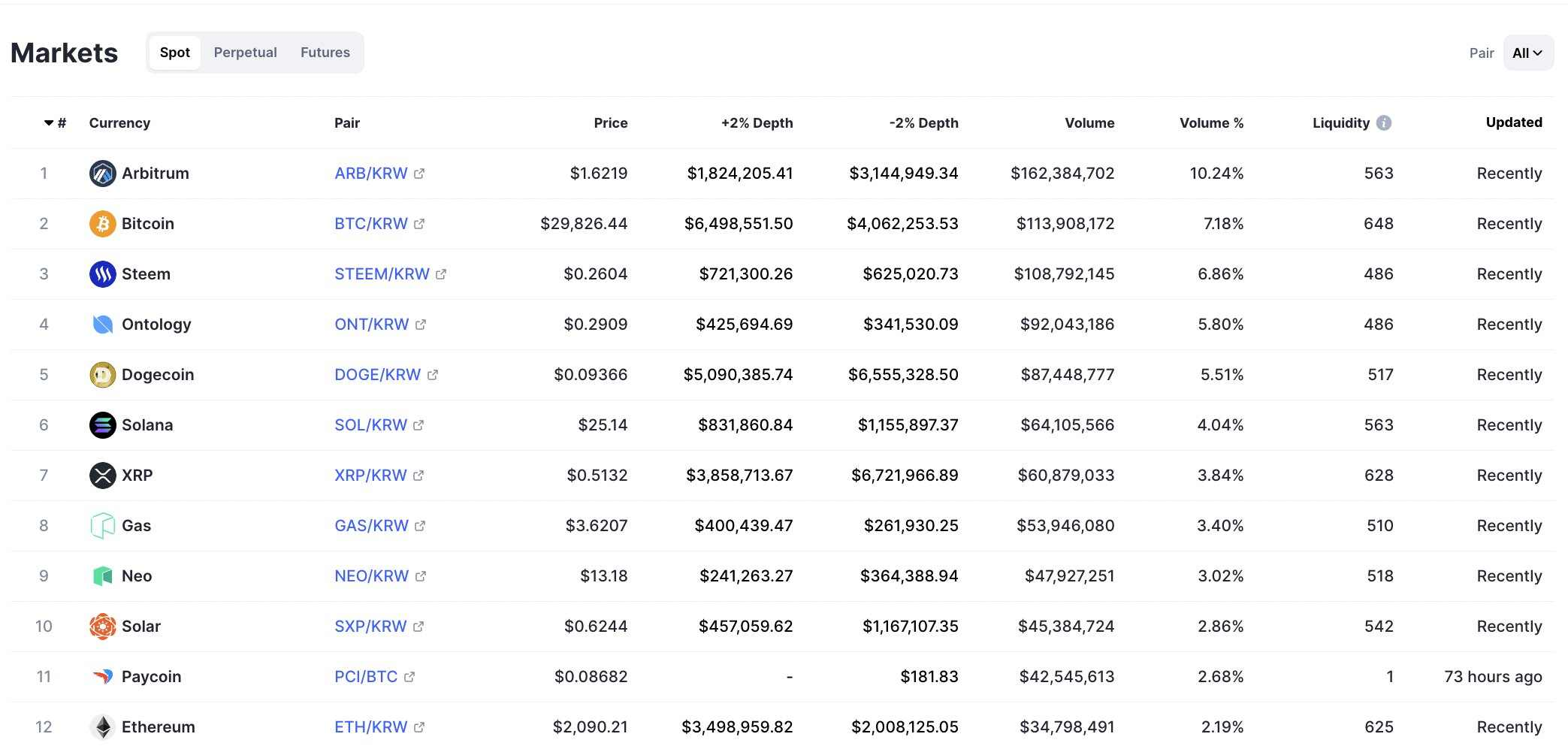 CoinMarketCap 想必大家都很熟悉,使用 CoinMarketCap 中的监测韩元相关交易对部分,该界面会按照交易量显示 token 排名以及其它相关指标,对于你追踪一些热门 token 很有必要。