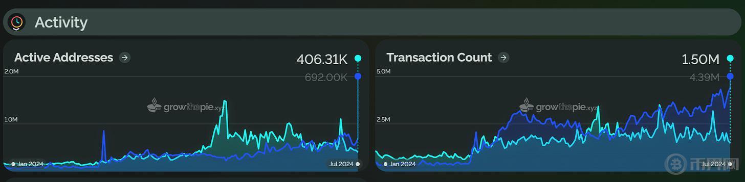 2024 年上半年,Scroll 的活跃地址数量较年初上涨了 13.4%,日均交易量则上涨了 27.7%。和 Scroll TVL 增幅不同,其活跃地址数量和日均交易量增幅不大。