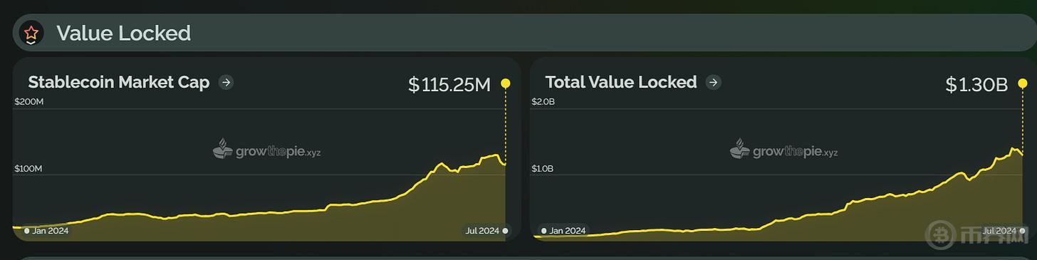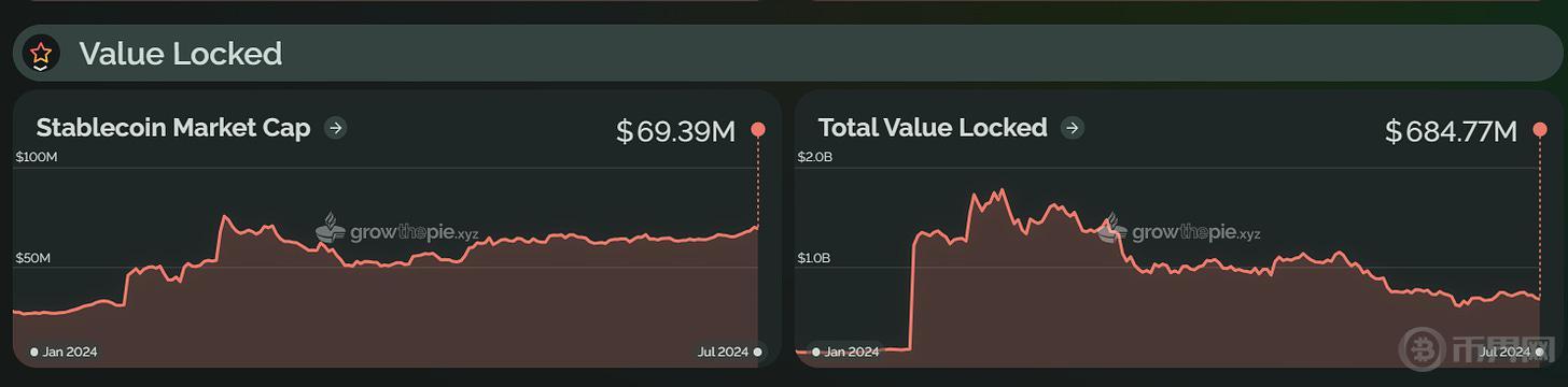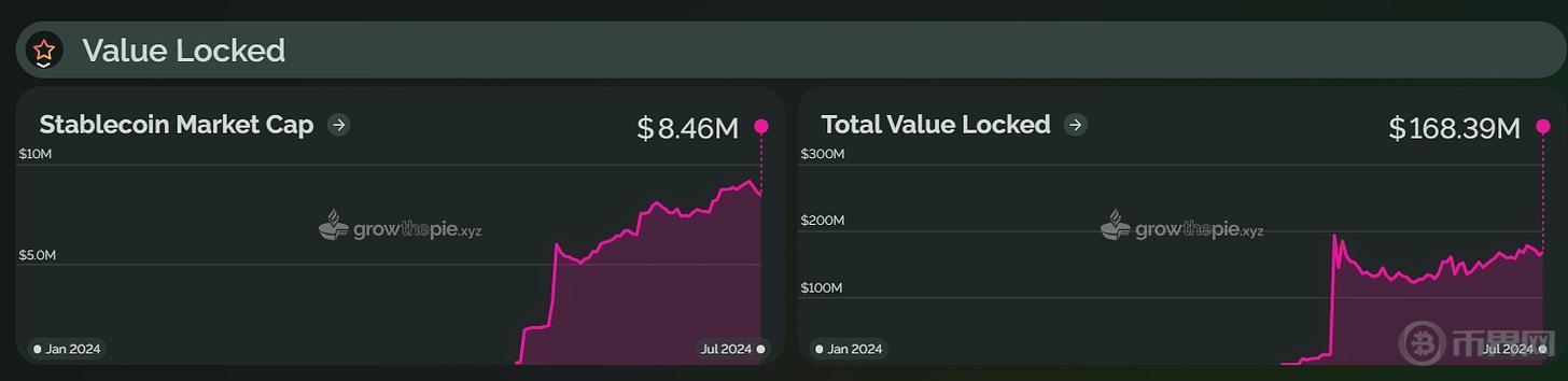 类似地,2024 年上半年,Starknet 总锁仓价值在 2 月 20 日开始显著上升,并在 3 月 14 日达到了历史新高,为 17.76 亿美元。这一增长主要受到 STRK 代币空投计划和 Starknet 基金会推出的「Starknet 春季 DeFi 激励计划」的推动。然而,截至目前,Starknet 的 TVL 已回落至约 6.85 亿美元,较巅峰值下降了约 61%。