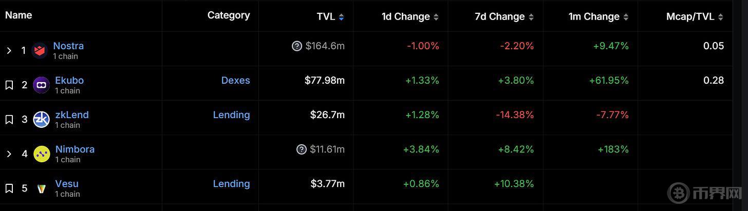 在生态进展方面,Starknet 生态目前已经集成了超过 100 个应用。Starknet 上总锁仓价值排名前五的项目均为 Starknet 原生项目。排名第一的是借贷协议 Nostra,锁仓价值为 1.646 亿美元;排名第二的是去中心化交易所 Ekubo,过去一个月 TVL 增长了 61.95%。目前为 7798 万美元;排名第三的是借贷协议 zkLend,TVL 为 2670 万美元。不过,Starknet 生态中超过千万美元 TVL 的项目仅有四个,排名第五的借贷协议 Vesu TVL 仅为 377 万美元。