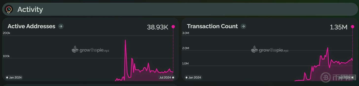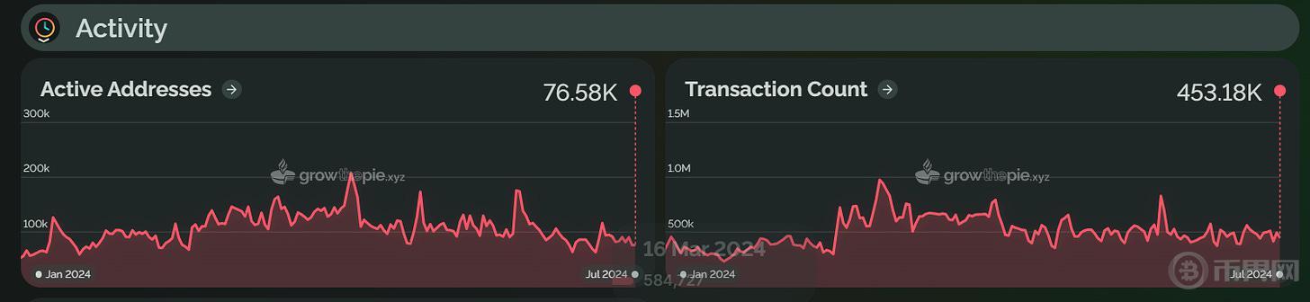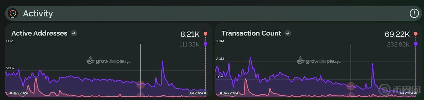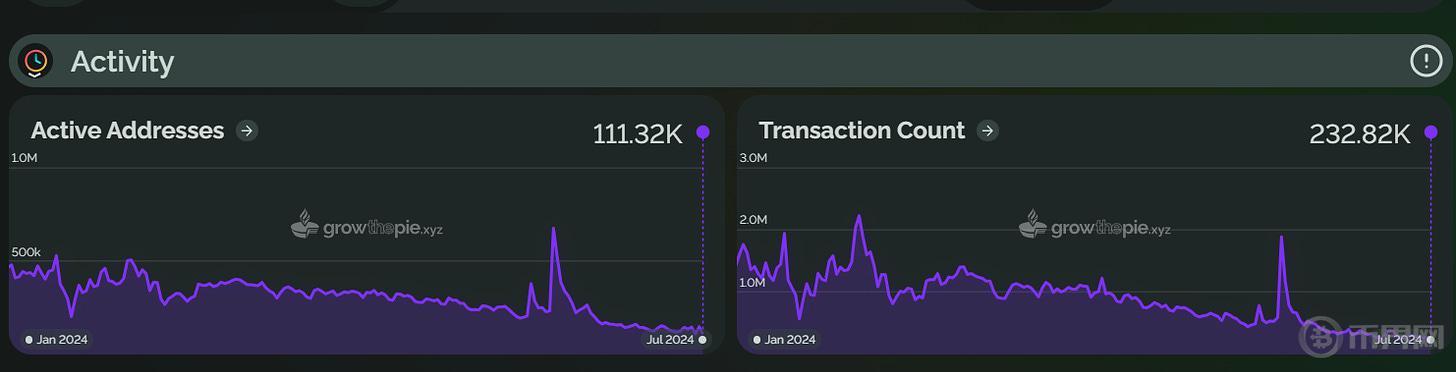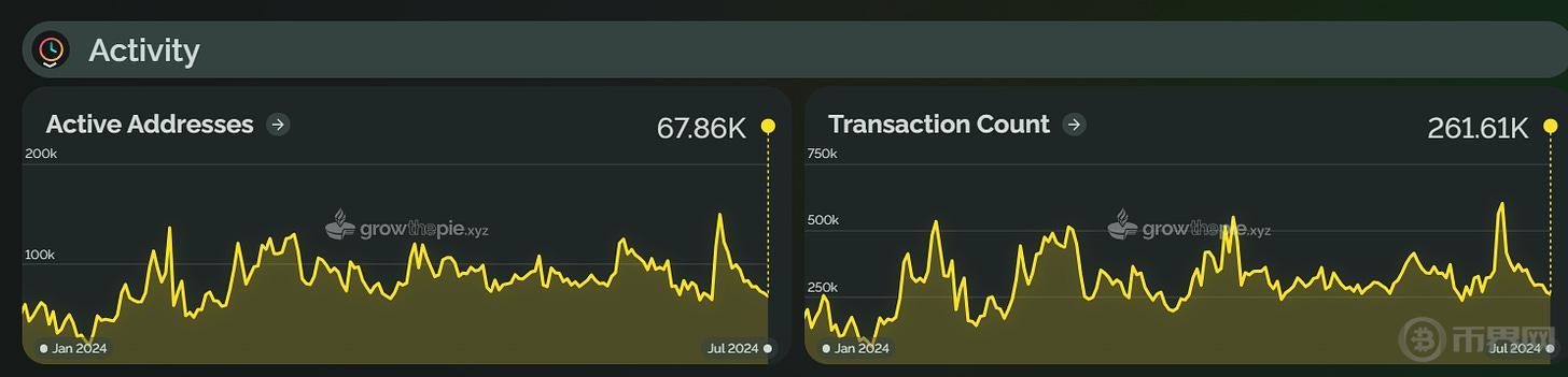Taiko 于 2024 年 5 月上线主网,其 TVL 在 6 月 5 日达到了 1.9 亿美元的历史高点,但随后回落至 1.6345 亿美元。活跃地址数量在 6 月峰值后下降了 78.3%。