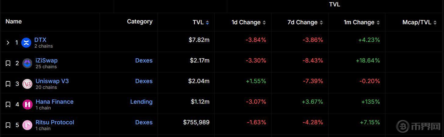 据 DeFiLlama 数据显示,Taiko 目前总锁仓价值排名前三的项目分别为去中心化永续交易平台 DTX、iZUMi Finance 旗下多链 DEX 平台 iZiSwap 及 Uniswap V3。总体来看,Taiko 生态项目 TVL 均不高,且 DTX 占据了较为显著的市场份额。